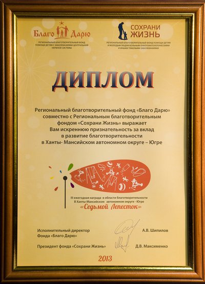 В этом году дипломантами номинации «Самое крупное предприятие – Донор» наряду с «Тюменьэнерго» стали ЗАО «Сибпромстрой» и «ООО «Газпром переработка», а всего дипломы были вручены по шести номинациям.