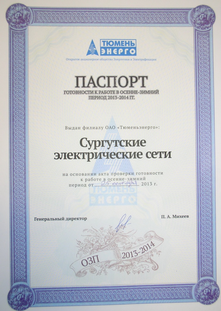 Проверка филиала комиссией завершилась получением паспорта готовности к работе в осенне-зимний период 2013-2014 годов. Председатель комиссии, заместитель начальника Департамента технического развития ОАО «Тюменьэнерго» Сергей Иваськов положительно оценил готовность филиала к зимнему пику нагрузок: «Комплексная, качественная подготовка электросетевого хозяйства к ОЗП, подготовка персонала и подготовка к ликвидации возможных чрезвычайных ситуаций - это три кита, на которых основывается надежная работа в зимний период Сургутских электрических сетей и компании «Тюменьэнерго» в целом. При проверке этих направлений замечаний, препятствующих выдаче паспорта готовности к прохождению грядущего максимума нагрузок, комиссией не выявлено. Все члены комиссии единогласно на итоговом рабочем совещании заявили о готовности предприятия. И я, как председатель комиссии, подтверждаю эту готовность».