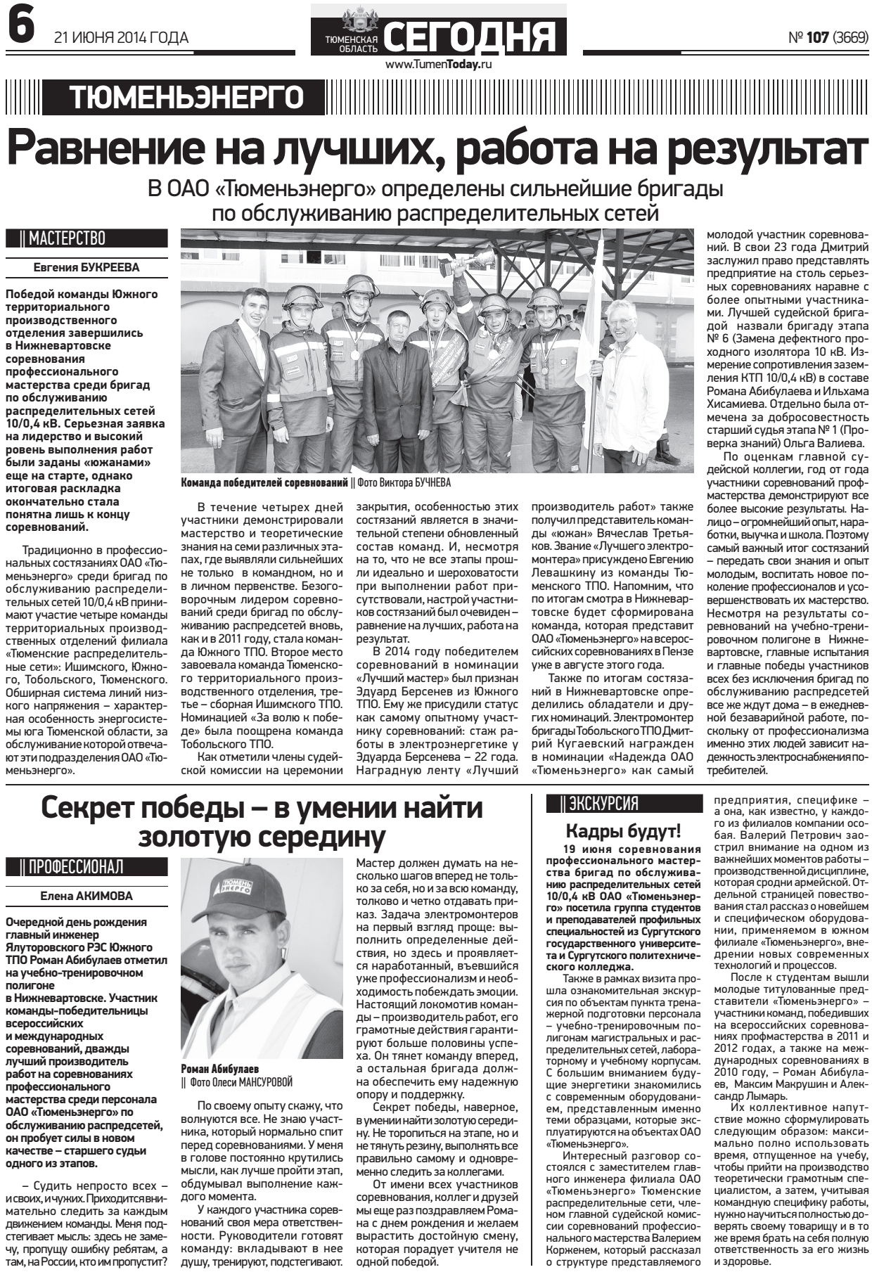 Публикация в издании "Тюменская область сегодня" от 21 июня 2014 г.