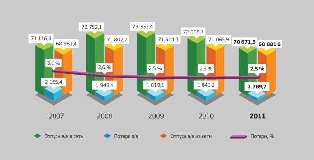 В 2011 году в сети ОАО «Тюменьэнерго» из сетей Федеральной сетевой компании, от производителей электрической энергии и смежных сетевых компаний в общей сложности было отпущено 70 671,3 млн кВт.ч электроэнергии. Передано конечным потребителям и территориальным сетевым компаниям 68 881,6 млн кВт.ч. Потери электрической энергии составили 1 789,7 млн кВт.ч, или 2,5 % от отпущенной в сеть ОАО «Тюменьэнерго» электроэнергии.