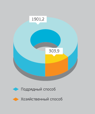 При этом затраты на ремонт, осуществленный хозяйственным способом, составили 303,9 млн руб.; затраты на работы, осуществленные по договорам подряда, — 1 901,2 млн руб.