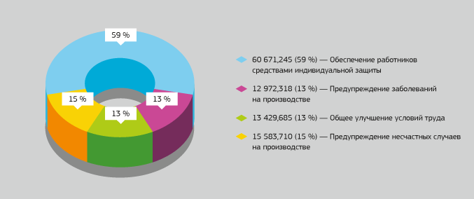 Затраты на мероприятия по охране трудаЗатраты на мероприятия по охране труда в 2011 году, включая затраты на мероприятия по обеспечению работников средствами защиты, по сравнению с 2010 годом увеличились на 31,66 % и составили 102 656,958 тыс. руб.; расходы на одного работника составили 14,17 тыс. руб.
