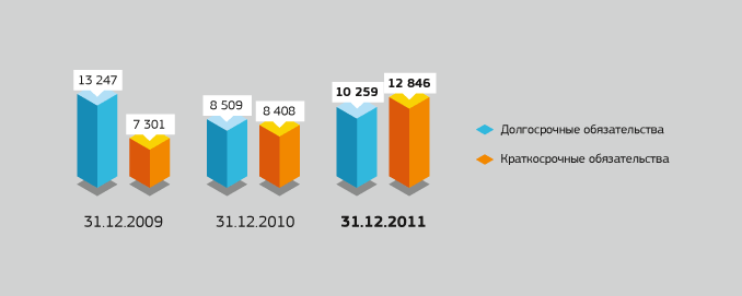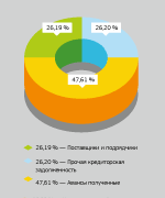 По итогам 2011 года наибольший удельный вес в кредиторской задолженности (КЗ) приходится на задолженность поставщикам и подрядчикам (26,2 %) и авансы, полученные по технологическому присоединению (47,6 %).