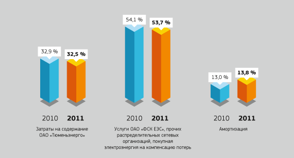 Себестоимость реализованных товаров, работ, услуг ОАО «Тюменьэнерго» в 2011 году составила 39 162 млн руб. (+5 % к уровню 2010 года). Рост себестоимости в 2011 году обусловлен увеличением инфраструктурных платежей и амортизационных отчислений.