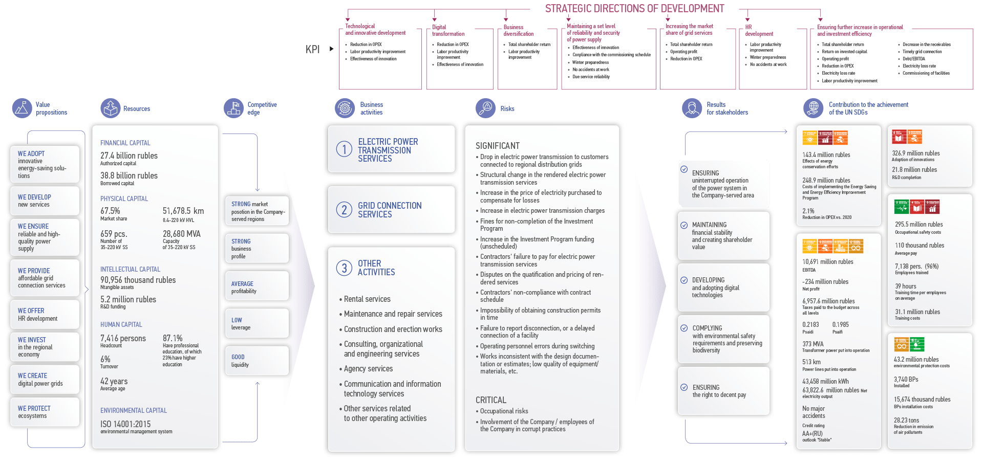 The systemic nature of the documents approved in 2021 by the Board of Directors, including the Innovative Development Program, the Energy Conservation and Energy Efficiency Program, the Program for Reducing Electricity Losses in Electricity Grids, and the Road Map for the Development of Additional (Non-Tariff) Services, set out our approaches to prioritized tasks, such as improving the performance of our core business, developing new business areas, ensuring reliability, maintaining high quality and providing equal access to energy infrastructure for our consumers, maintaining a balance between the interests of all our stakeholders and generating a positive net cash flow.