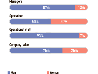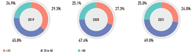 Almost half of the Company’s employees are aged 35 to 50 – 49%. Young workers under the age of 35 – 26%. There is a slight decrease in the percentage of employees in the category “over 50 years old” by 0.1 p.p. as compared to 2020.