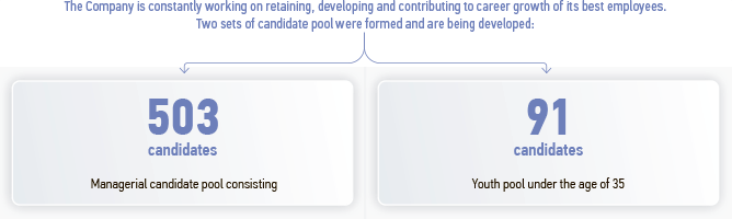 Candidate pool is formed at all levels of management and covers all positions from the operations manager to the top manager. As a result of candidate pool development measures, candidate pool covers 95% of the targeted positions.