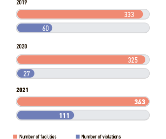 In 2021, physical protection system underwent qualitative changes in terms of the number of facilities under physical protection: 287 vs 228 in 2020 – and power grid facilities provided with security guards: 91 vs 54 in 2020. The requirements for the quality of physical protection services were raised, measures to control the comprehensive security system were strengthened.