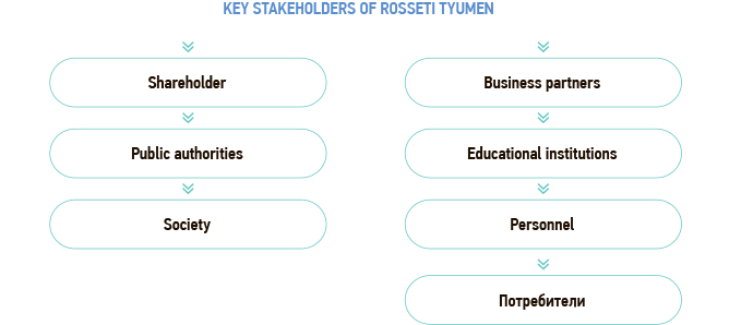 Rosseti Tyumen JSC strives to be highly transparent in its business by having a proactive dialog with all the stakeholders including federal and regional authorities, local self-governments, public organizations, educational institutions, scientific, expert communities and business community, general public, mass media and other social institutions. Individual structural divisions of the Company are responsible for interaction with specific groups of stakeholders.