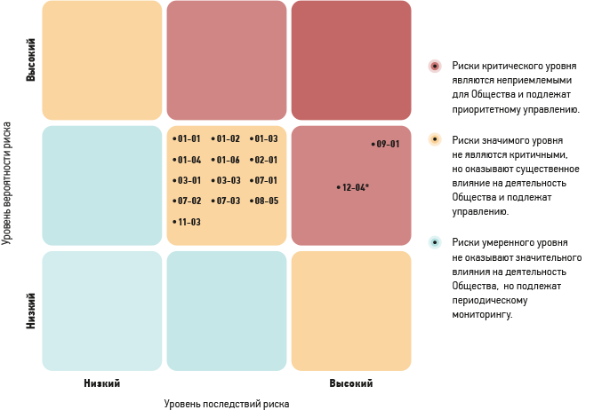 * Риск ФР 12-04 «Вовлечение Общества / работников Общества в коррупционную деятельность» оценивается как «критический» в связи с неприемлемостью коррупции в любых формах и проявлениях в Обществе (принцип «нулевой толерантности к коррупции») и необходимостью принятия первоочередных (приоритетных) мер по управлению данным риском, при этом уровень вероятности риска оценивается как низкий.