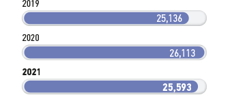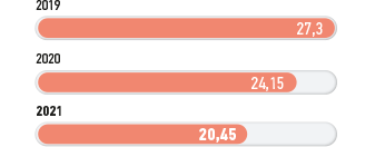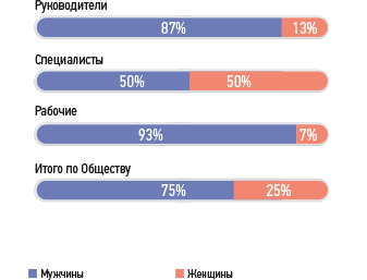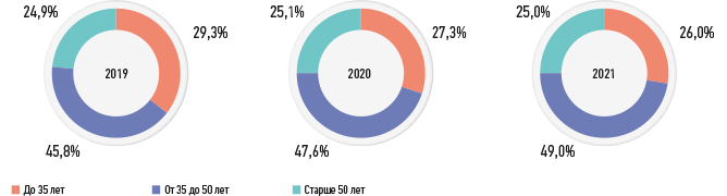 Почти половина работников Общества составляет персонал в возрасте от 35 лет до 50 лет — 49%. Молодые работники в возрасте до 35 лет — 26%. Наблюдается незначительное уменьшение доли работников в возрастной категории «старше 50 лет» на 0,1 п. п. по отношению 2020 году.
