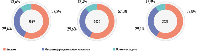 Работники АО «Россети Тюмень» характеризуются высоким уровнем квалификации: 3 работника компании имеют ученую степень кандидата наук, 87,1% сотрудников имеют профессиональное образование, из них доля рабочих с высшим профессиональным образованием составляет 23%, что говорит о высоком уровне подготовки производственного персонала.