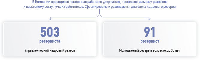 Формирование кадрового резерва происходит на всех уровнях управления и охватывает все должности от линейного руководителя до руководителя высшего звена. Значимым результатом проведения мероприятий по работе с кадровым резервом является обеспеченность резервом целевых должностей на 95%.