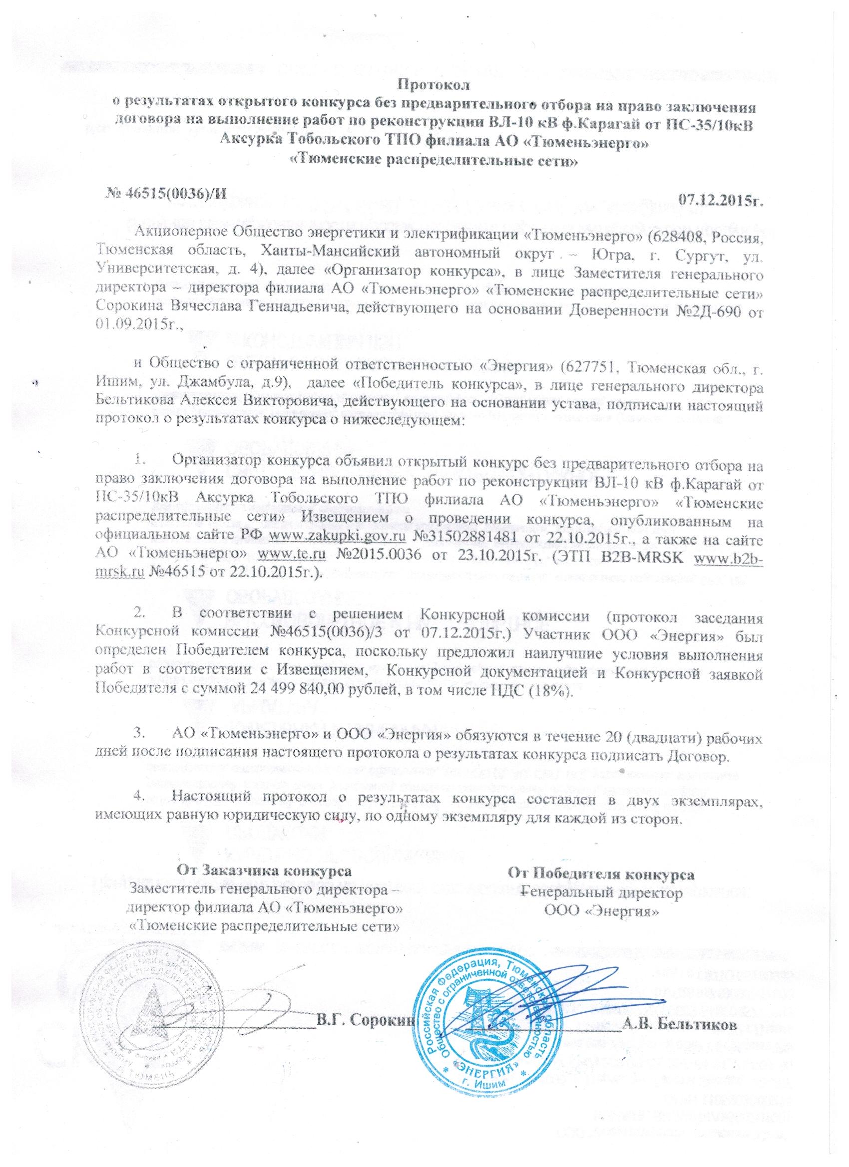 | Наименование | Открытый одноэтапный конкурс без предварительного отбора на право заключения Договора на выполнение работ по реконструкции ВЛ-10 кВ ф.Карагай от ПС-35/10кВ Аксурка Тобольского ТПО филиала АО «Тюменьэнерго» Тюменские распределительные сети |