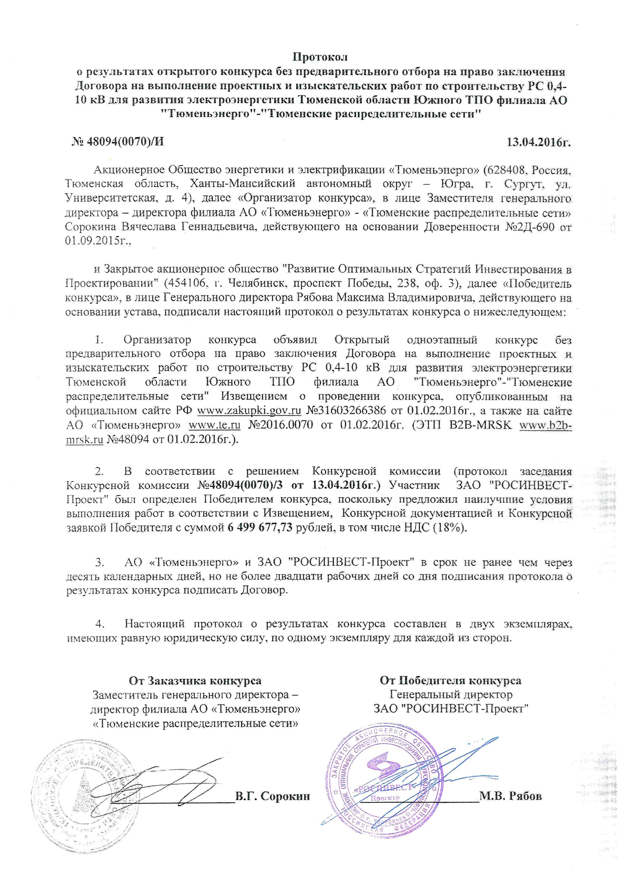 | Наименование | Открытый одноэтапный конкурс без предварительного отбора на право заключения Договора на выполнение проектных и изыскательских работ по строительству РС 0,4-10 кВ для развития электроэнергетики Тюменской области Южного ТПО филиала АО "Тюменьэнерго"-"Тюменские распределительные сети" |