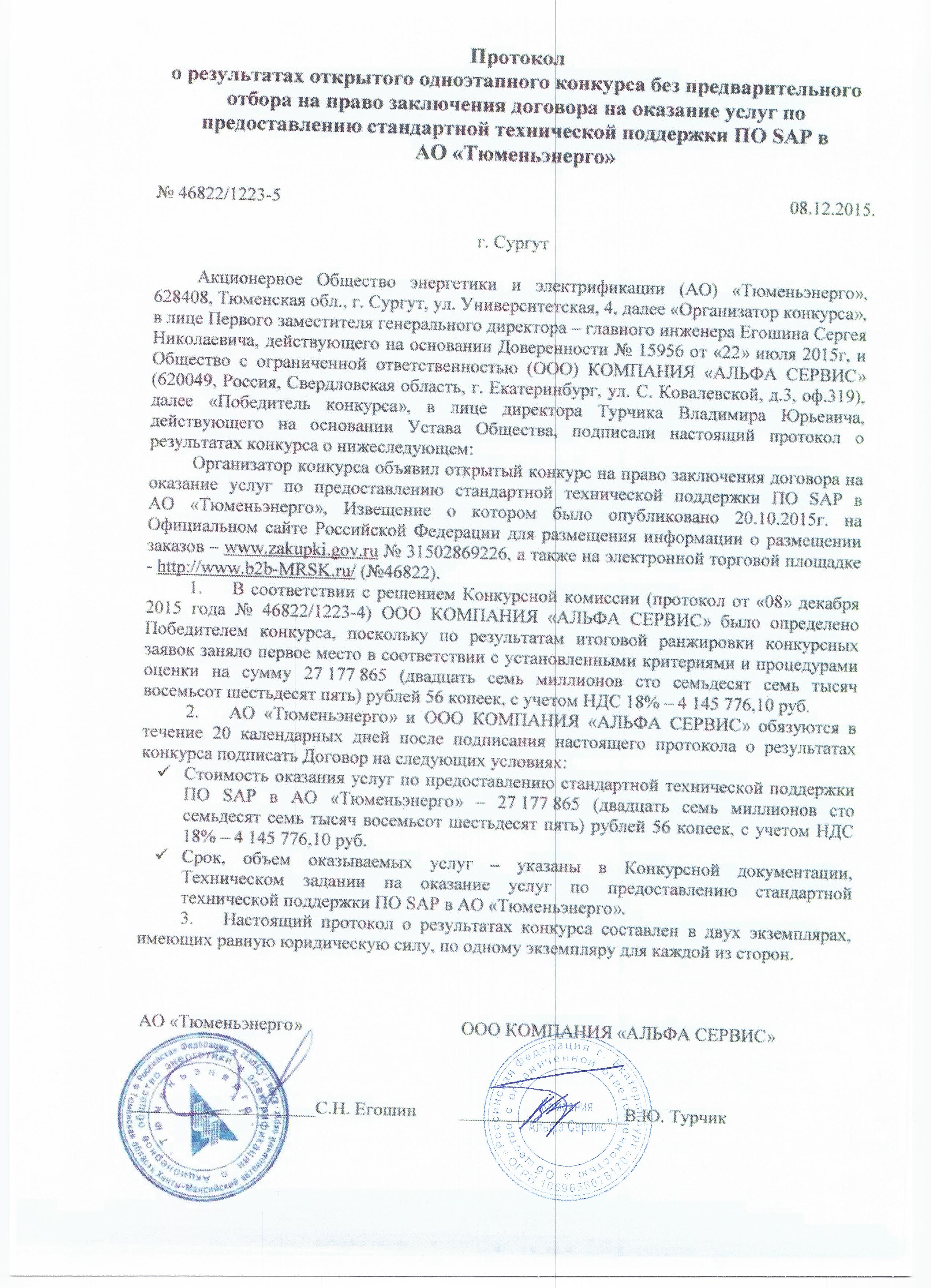 | Наименование | Открытый одноэтапный конкурс без предварительного отбора на право заключения Договора на оказание услуг по предоставлению стандартной технической поддержки ПО SAP в АО «Тюменьэнерго» |
