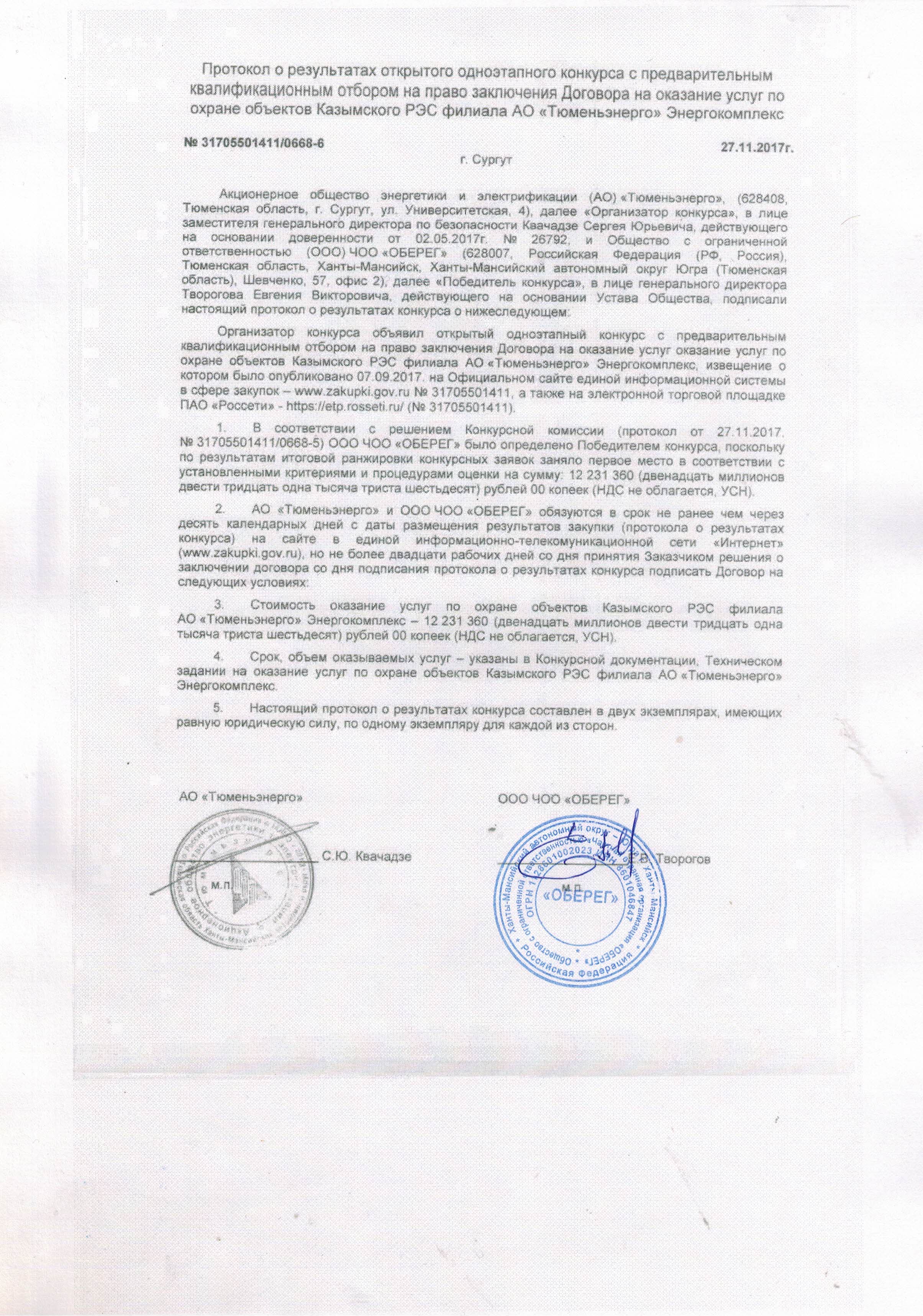 | Наименование | Открытый одноэтапный конкурс с предварительным квалификационным отбором на право заключения Договора на оказание услуг по охране объектов Казымского РЭС филиала АО «Тюменьэнерго» Энергокомплекс |