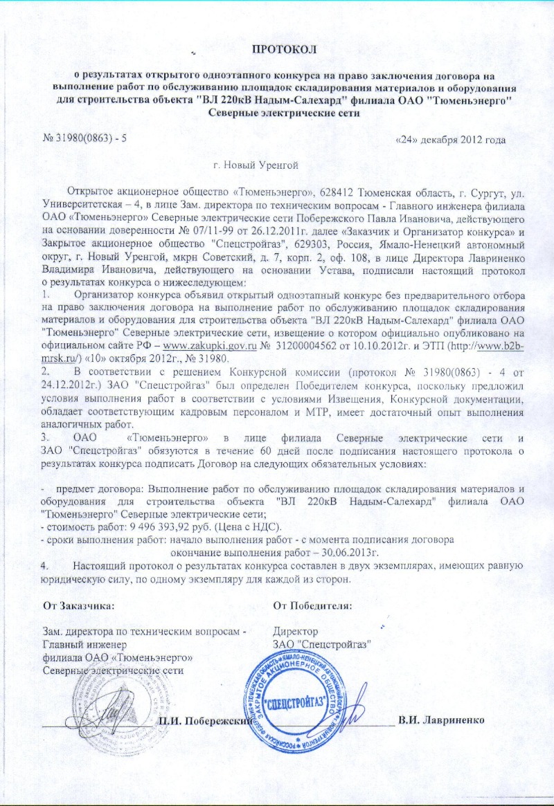 | Наименование | Выполнение работ по обслуживанию площадок складирования материалов и оборудования для строительства объекта "ВЛ 220кВ Надым-Салехард" филиала ОАО "Тюменьэнерго" Северные электрические сети |